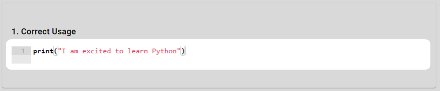 _id: ryan1order: 0story: 1lesson: Why Python?sublesson:line: 1payloadType: markdowntype: codeAreapayload: print(“I am excited to learn Python”)