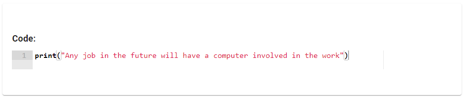 _id: ryan1order: 0story: 1lesson: Why Python?sublesson:line: 1payloadType: markdowntype: codeAreaTitlepayload: print(“Any job in the future will have a computer involved in the work”)
