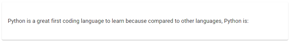 "Python is a great first coding language to learn because compared to other languages, Python is:"